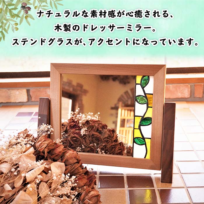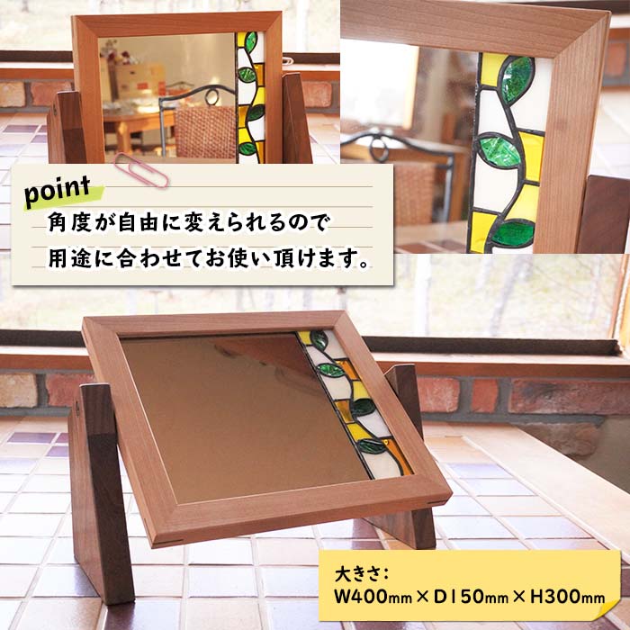 返礼品説明 名称 ドレッサーミラー 内容 材料:枠はサクラ材、スタンドはブラックウォールナット材使用 サイズ:W400mm×D150mm×H300mm ※木材、ステンドグラスの色目は、サンプル画像とは多少異なります。